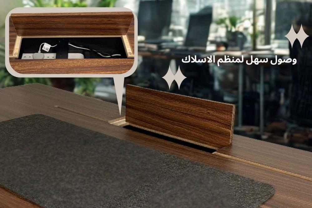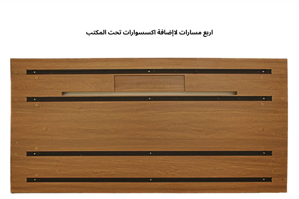 يحتوي المكتب على بوكس علوي مخفي يفتح بسهولة للوصول إلى منظم الأسلاك الداخلي، ما يحافظ على مظهر نظيف واحترافي لمساحة العمل. كما يأتي مزودًا بـ أربع مسارات T-Rail أسفل السطح تتيح إضافة إكسسوارات مستقبلية مثل منظم كيابل، أدراج، أو حامل كمبيوتر بكل مرونة.