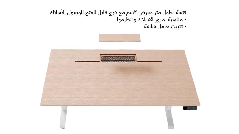 مكتب وقوف كهربائي بتصميم عملي وعصري، صُمم ليمنحك أقصى درجات الراحة والتنظيم أثناء العمل أو اللعب. يتميز بسطح متين مع فتحة مستقيمة بطول 1 متر وعرض 2 سم مدمجة في سطح المكتب، مثالية لتمرير الأسلاك أو تركيب حامل شاشة، ميكروفون، أو إكسسوارات البث دون فوضى.